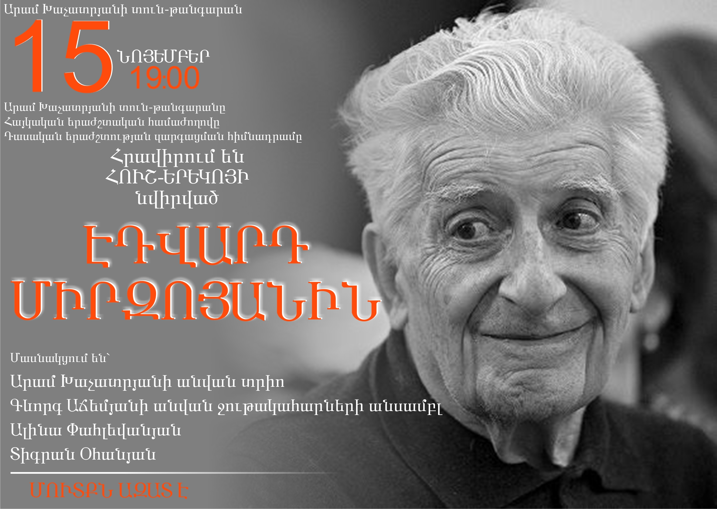 Сообщите, напомните ереванским друзьям и знакомым об этом вечере, пусть сходят в Музей им.А.И.Хачатуряна, — получат заряд эстетического радости, согреют душу, услышат много занимательного. Ведь об Эдварде Михайловиче Мирзояне можно много поведать — неординарная была творческая и общественная личность.