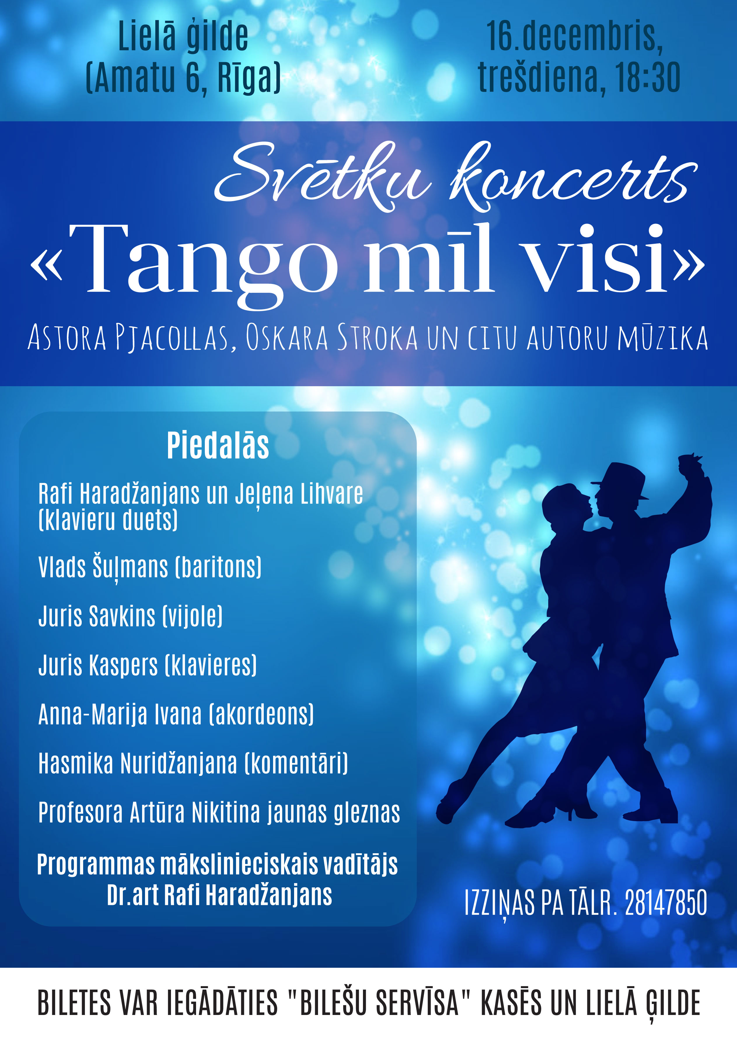 16-го декабря в 18.30 приглашаем вас на заражающий энергией концерт «Танго любят все!» Это будет яркая, контрастная программа с очень высоким уровнем исполнительского мастерства. Страстные и энергичные танго Астора Пьяцоллы, Оскара Строка и других корифеев аргентинского танца, для вас исполнит фортепианный дуэт, споёт певец, сыграют скрипач и аккордеонист. С помощью видеопроекции вспомним некоторые наиболее яркие номера зажигательного танца в исполнении корифеев мировой сцены.
