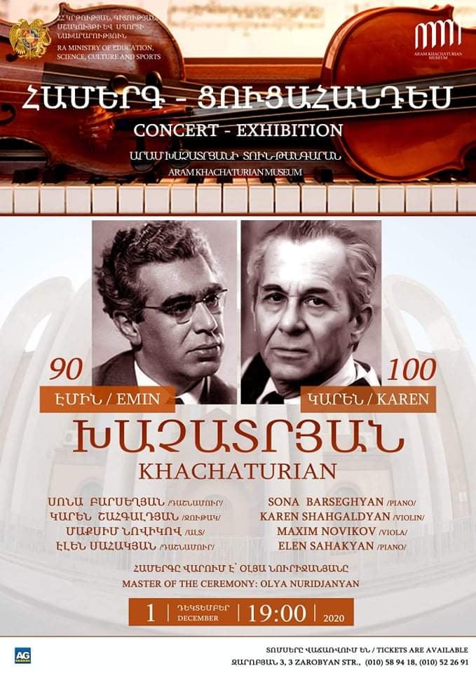 Դեկտեմբերի 2-ին, ժամը՝ 16:00-ին Արամ Խաչատրյանի տուն-թանգարանը հրավիրում է մասնակցելու Արամ Խաչատրյանի զարմիկների` ճանաչված երաժիշտներ Կարեն Խաչատրյանի 100֊ամյա և Էմին Խաչատրյանի 90֊ամյա հոբելյաններին նվիրված համերգ֊ցուցահանդեսին։